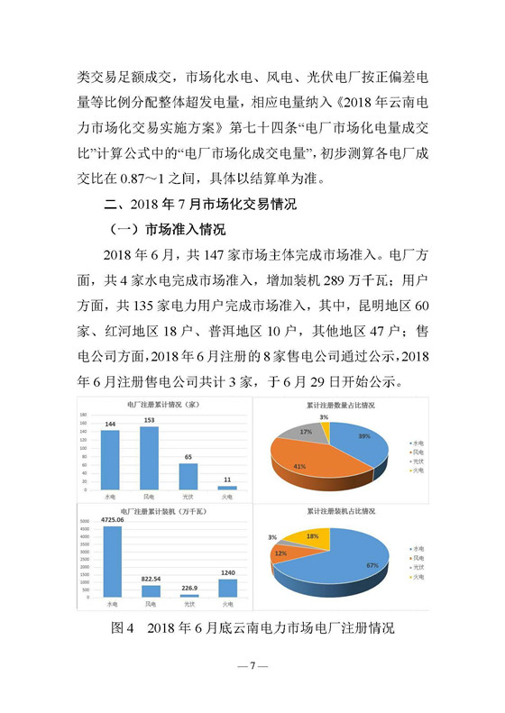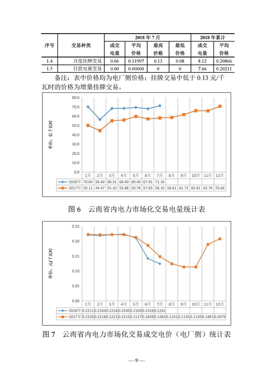 昆明電力交易中心發(fā)布了《云南電力交易月報(bào)》,2018年6月份成交電量68 44億千瓦時(shí),平均成交價(jià)0 14174元 千瓦時(shí),7月份省內(nèi)市場(chǎng)成交電量71