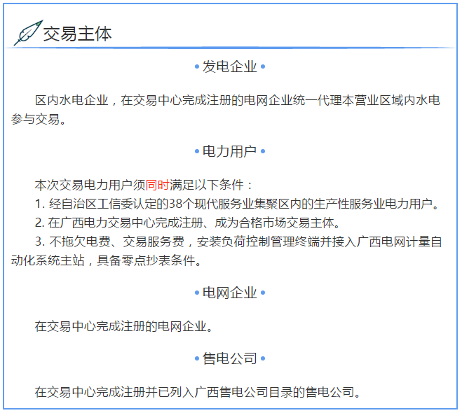 廣西電力交易中心發(fā)布的《關(guān)于開(kāi)展2018年8月現(xiàn)代服務(wù)業(yè)集聚區(qū)用電市場(chǎng)化交易的通知》文件,發(fā)電企業(yè):區(qū)內(nèi)水電企業(yè),在交易中心完成注冊(cè)的