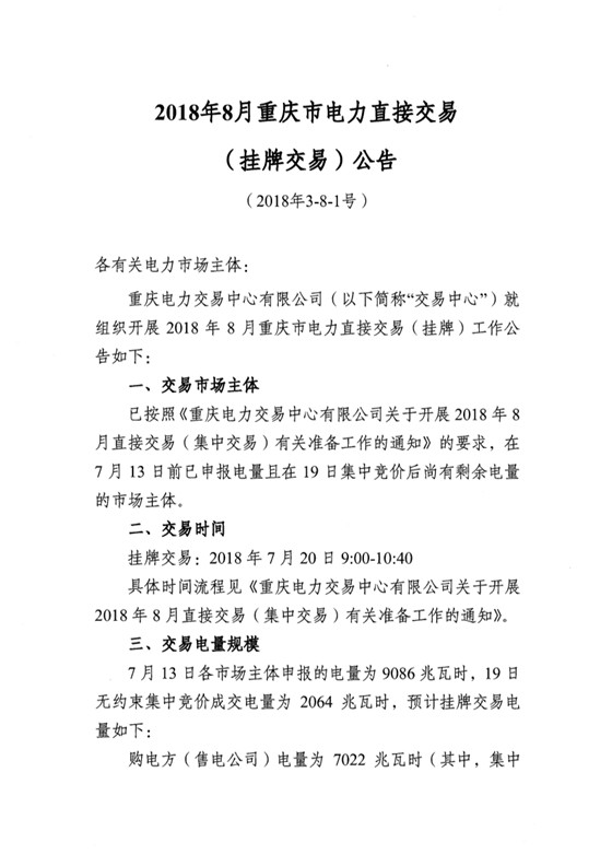 重慶電力交易中心日前發(fā)布了《2018年8月重慶市電力直接交易(掛牌交易)工作公告》,預(yù)計(jì)掛牌交易電量如下:購電方(售電公司)電量為7022兆瓦
