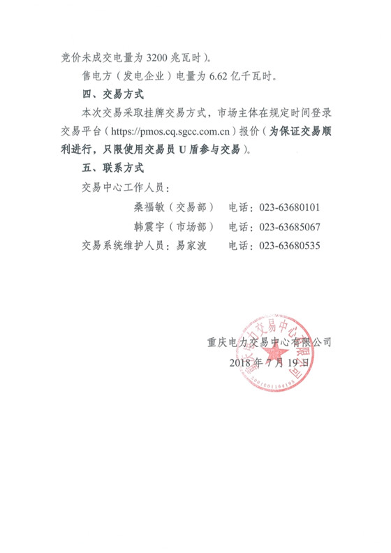 重慶2018年8月掛牌交易20日開展: 售電方(發(fā)電企業(yè))電量為6.62億千瓦時(shí)
