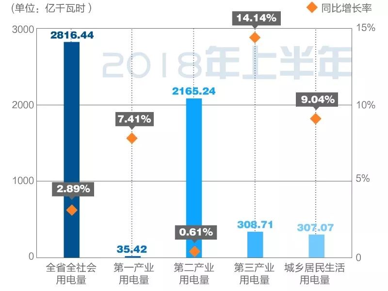 2018年上半年,全省全社會用電量完成2816.44億千瓦時,同比增長2.89%。其中,第一產(chǎn)業(yè)用電量較快增長,完成35.42億千瓦時,同比增長7.41%;第二產(chǎn)業(yè)用電量略有增長,完成2165.24億千瓦時,同比增長0.61%;第三產(chǎn)業(yè)用電量快速增長,完成308.71億千瓦時,同比增長14.14%;城鄉(xiāng)居民生活用電量較快增長,完成307.07億千瓦時,同比增長9.04%。