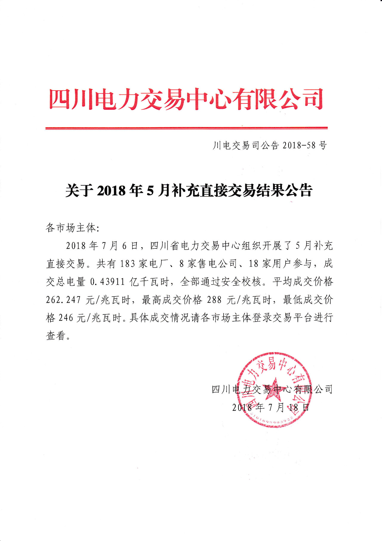 四川2018年5月補(bǔ)充直接交易結(jié)果:平均成交價(jià)為262.247元/兆瓦時(shí)