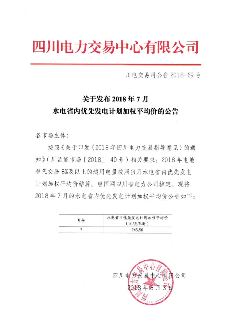 關(guān)于發(fā)布2018年7月水電省內(nèi)優(yōu)先發(fā)電計(jì)劃加權(quán)平均價(jià)的公告