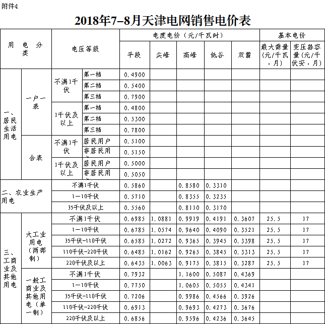 ˙2018年7-8月天津電網(wǎng)銷售電價(jià)表
