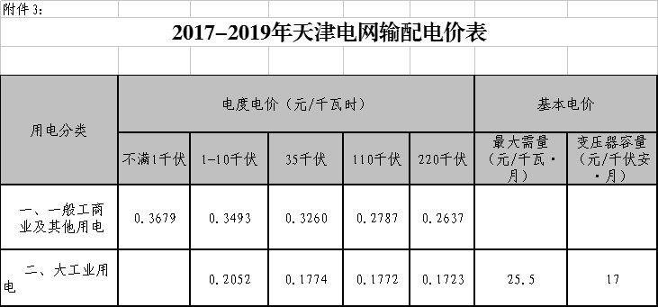 ˙2017-2019年天津電網(wǎng)輸配電價(jià)表