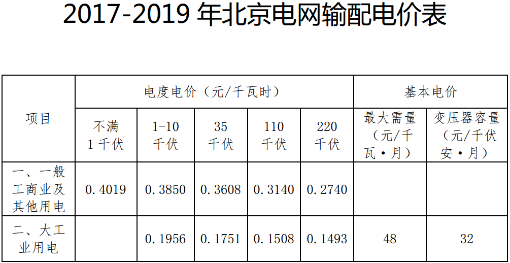 北京市發(fā)改委日前發(fā)布了《關(guān)于調(diào)整本市輸配電價(jià)有關(guān)問題的通知》,自2018年9月1日起,2017-2019年北京電網(wǎng)輸配電價(jià)中一般工商業(yè)及其他用戶電度電價(jià)每千瓦時(shí)降低4.29分。詳情如下: