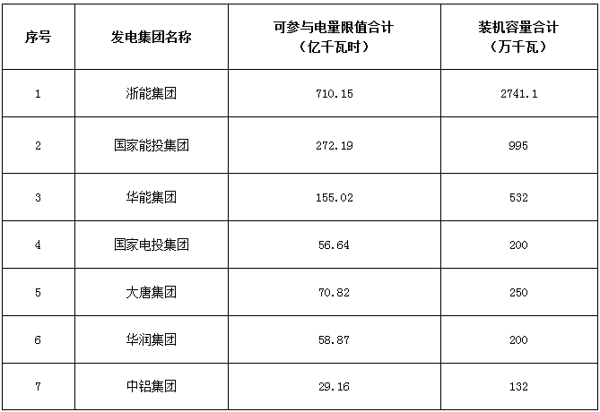 各發(fā)電集團燃煤電廠參與本次試點電量限值及裝機容量