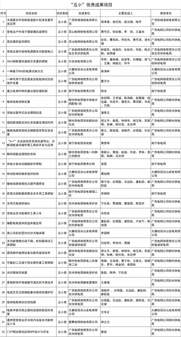 近日,廣西電力行業(yè)協(xié)會(huì)公示電力行業(yè)企業(yè)創(chuàng)新優(yōu)秀成果評(píng)審結(jié)果,報(bào)送成果項(xiàng)目284項(xiàng),共評(píng)出管理創(chuàng)新類、技術(shù)創(chuàng)新類一、二、三等獎(jiǎng)項(xiàng)目96項(xiàng)