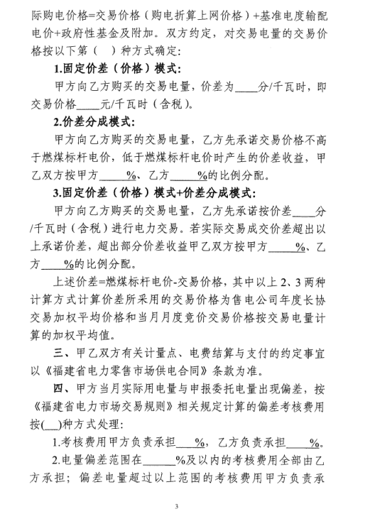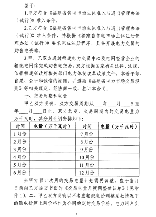 國家能源局福建監(jiān)管辦日前發(fā)布了《福建省電力市場交易相關(guān)合同示范文本的通知》,其中包含《福建省電力直接交易三方合同》(示范文本)、《