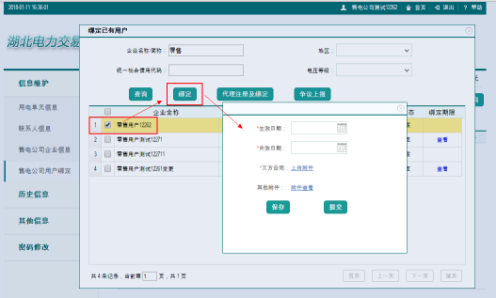 在彈出的綁定窗口中,查詢需綁定的零售用戶,選定待綁定零售用戶,點(diǎn)擊【綁定】,在彈出窗口中填寫相關(guān)信息并上傳附件,依次點(diǎn)擊【保存】、【提交】。