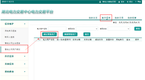 售電公司及零售用戶賬號(hào)均審核通過后,售電公司通過注冊(cè)的帳號(hào)密碼登錄電力交易平臺(tái),一次選擇【基本信息】、【售電公司用戶綁定】、【綁定零售用戶】進(jìn)入綁定菜單。