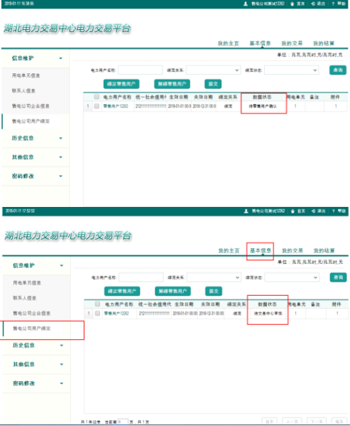 提交成功后,數(shù)據(jù)狀態(tài)為“待零售用戶確認(rèn)”,用戶登錄零售用戶帳號(hào)進(jìn)行確認(rèn)后,將自動(dòng)提交至交易中心,待交易中心審批。提交多個(gè)零售用戶可重復(fù)步驟2、步驟3。