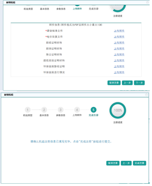 上傳注冊(cè)機(jī)組所需要的附件信息(附件類型必須為PDF格式),其中“建設(shè)核準(zhǔn)文件”、“電價(jià)批復(fù)文件”為必須上傳附件。然后點(diǎn)擊【下一步】完成此機(jī)組的注冊(cè)。