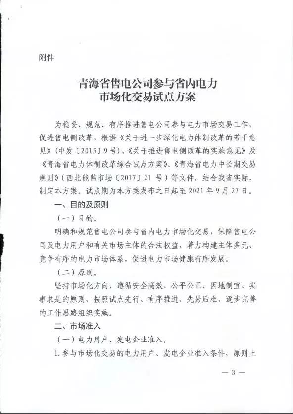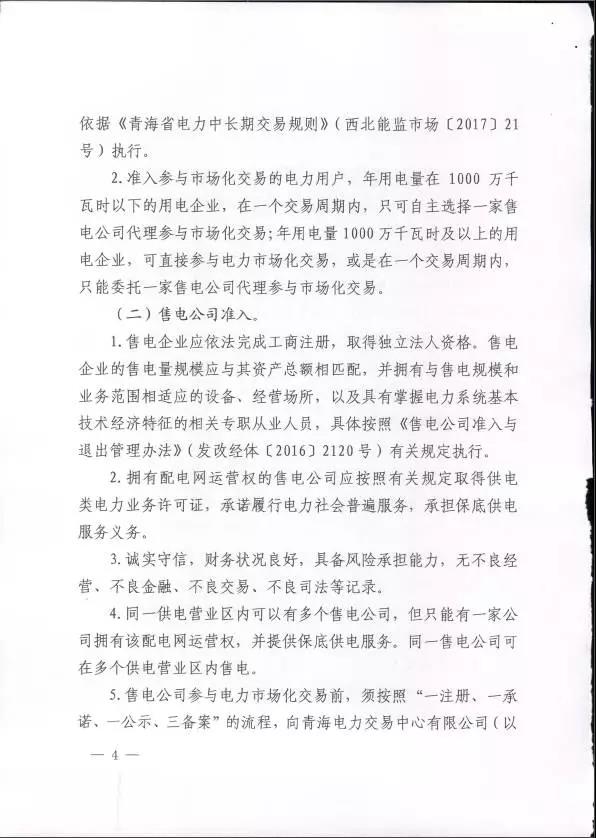 青海省發(fā)改委、青海省能源局、青海省經(jīng)信委、西北能監(jiān)局日前聯(lián)合發(fā)布了關(guān)于印發(fā)《青海省售電公司參與省內(nèi)電力市場(chǎng)化交易試點(diǎn)方案》的通知,要求售電公司參與交易年度周期內(nèi),原則上代理用戶的總用電量至少應(yīng)在3000萬千瓦時(shí)以上。