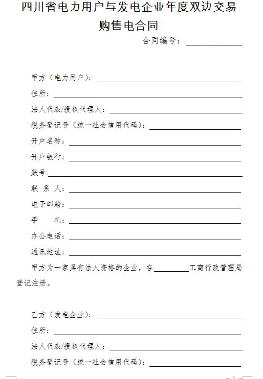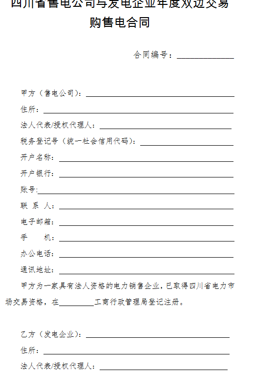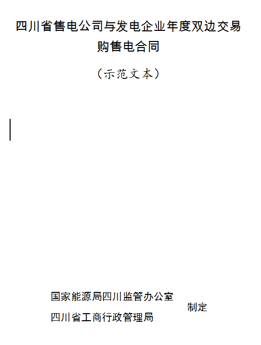 國家能源局四川監(jiān)管辦公室與四川省工商行政管理局,依據(jù)相關(guān)法律、法規(guī)、規(guī)章,共同制定了《四川省市場化零售供用電合同(示范文本)》《四川省售電公司與發(fā)電企業(yè)年度雙邊交易購電合同(示范文本)》《四川省售電公司與電力用戶購售電合同(示范文本)》和《四川省電力用戶與發(fā)電企業(yè)年度雙邊交易購售電合同(示范文本)》。