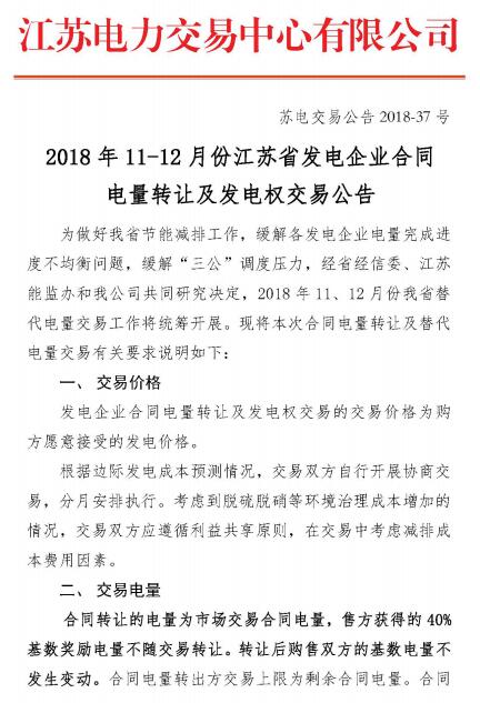 江蘇2018年11-12月發(fā)電企業(yè)合同電量轉(zhuǎn)讓及發(fā)電權(quán)交易:售方獲得的40%基數(shù)獎勵電量不隨交易轉(zhuǎn)讓