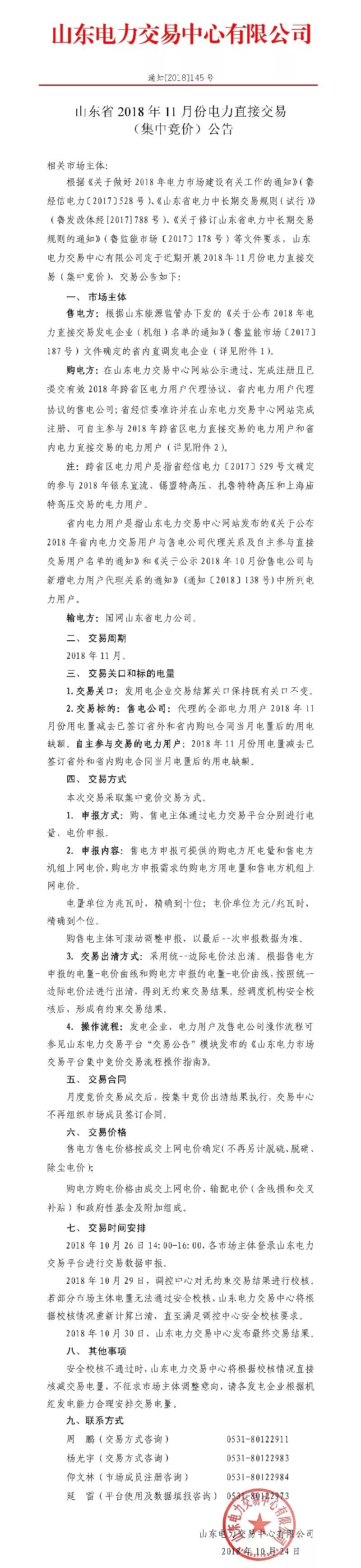 山東省2018年11月份電力直接交易 (集中競價)公告