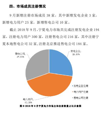 截止2018年9月,寧夏電力市場共完成注冊發(fā)電企業(yè)194家,注冊電力用戶300家,注冊售電公司216家,其中注冊寧夏本地售電公司32家,注冊北京推送售電公司184家。