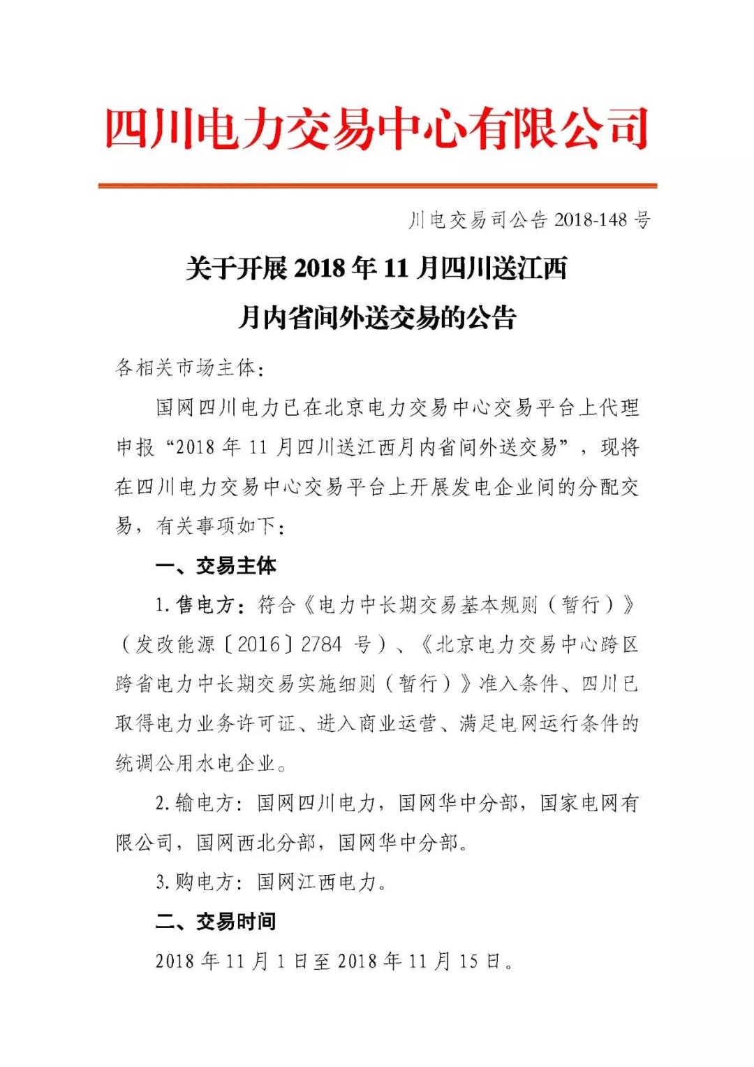 公告| 關(guān)于開展2018年11月四川送江西月內(nèi)省間外送交易的公告