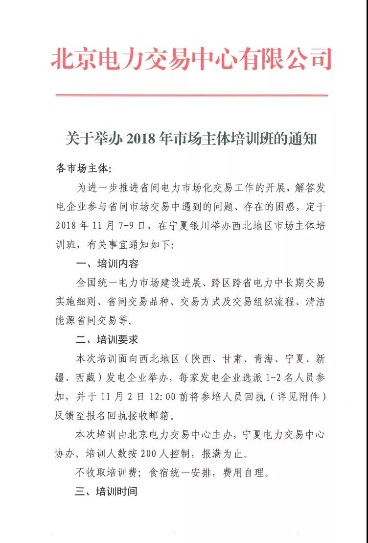 北京電力交易中心《關(guān)于舉辦2018年市場主體培訓班的通知》