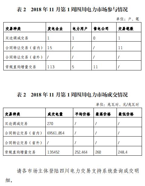 四川2018年11月第1周周交易:合同轉(zhuǎn)讓交易(省內(nèi))成交電量69561.854兆瓦時