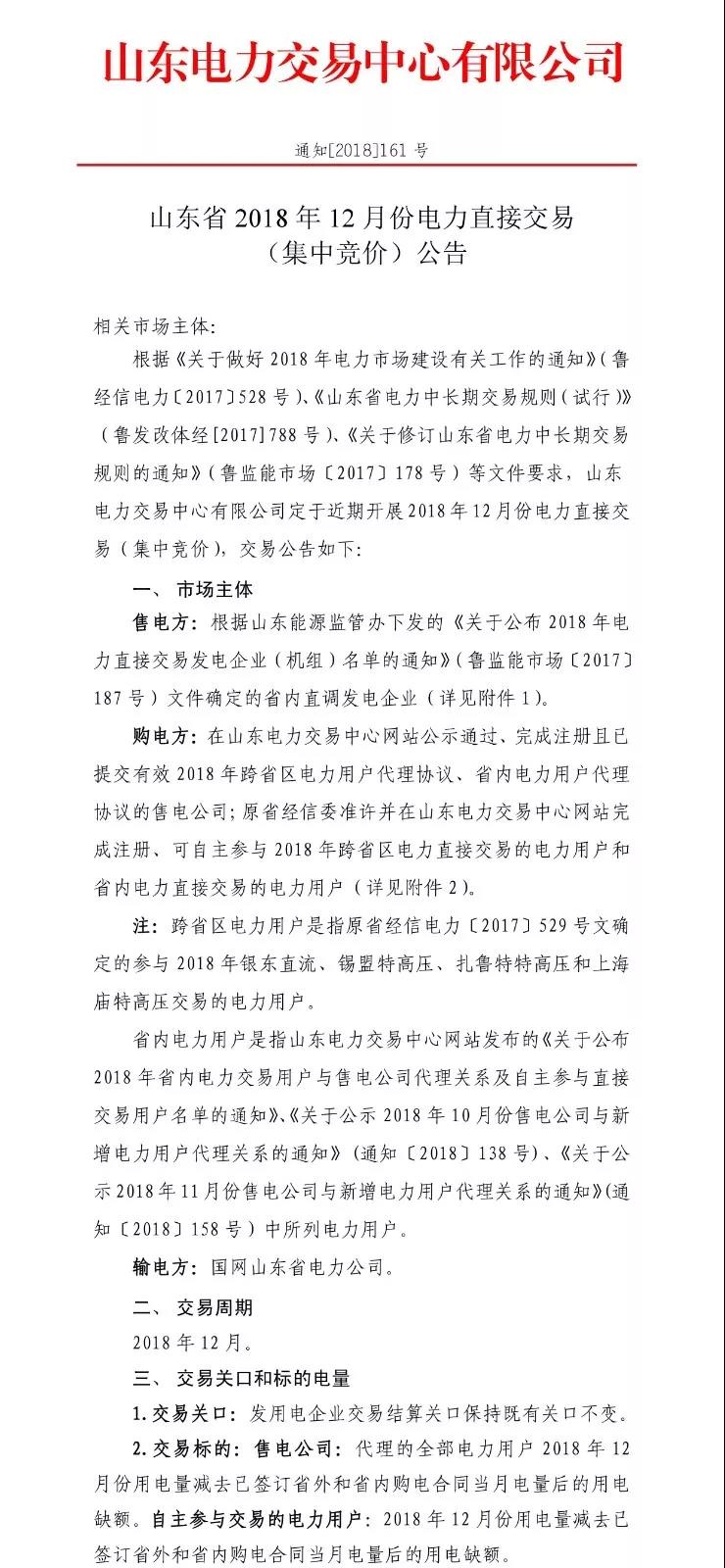 山東省2018年12月份電力直接交易(集中競(jìng)價(jià))公告