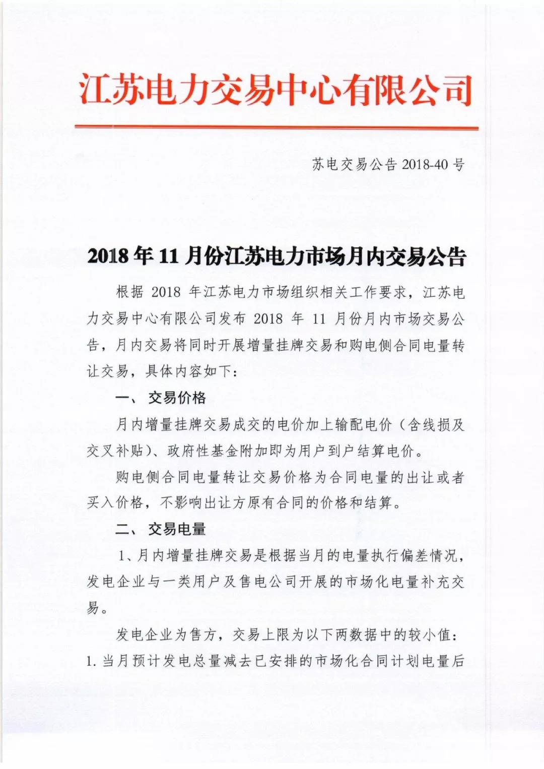 2018年11月份江蘇電力市場月內(nèi)交易公告