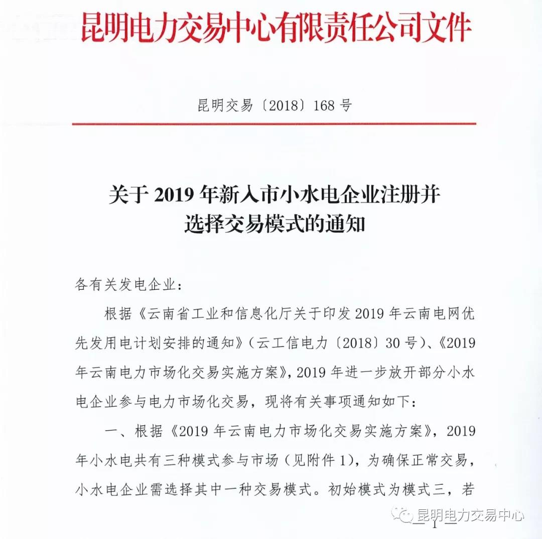云南關于2019年新入市小水電企業(yè)注冊并選擇交易模式的通知