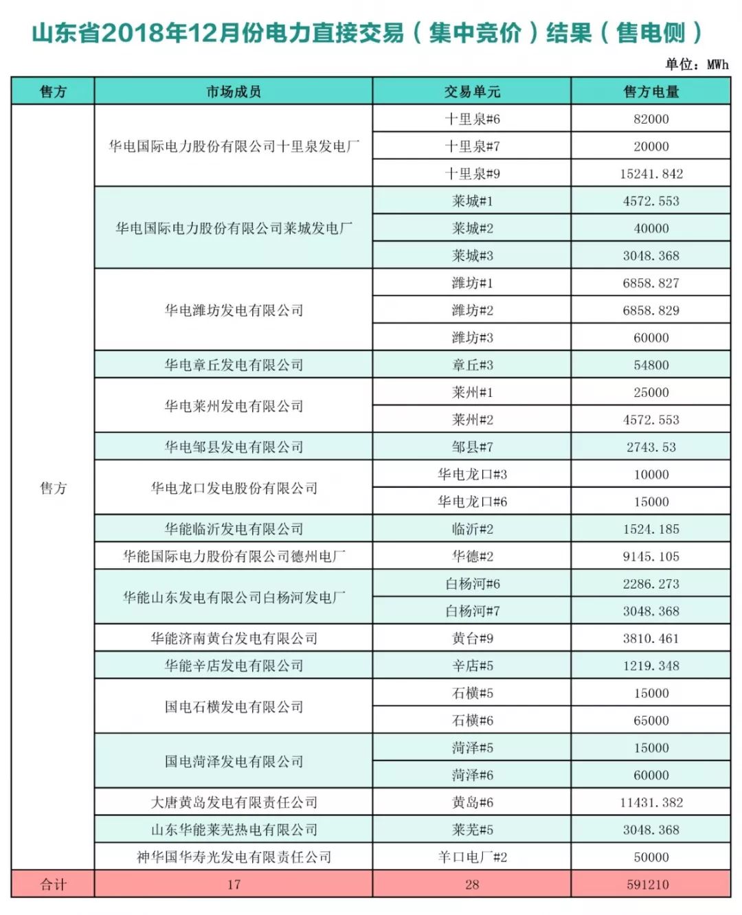 無約束交易結(jié)果經(jīng)山東電力調(diào)度控制中心安全校核后,確認17家統(tǒng)調(diào)發(fā)電企業(yè)(28臺發(fā)電機組)與1家電力用戶和15家售電公司達成交易電量591210兆瓦時,統(tǒng)一出清價為393元/兆瓦時。