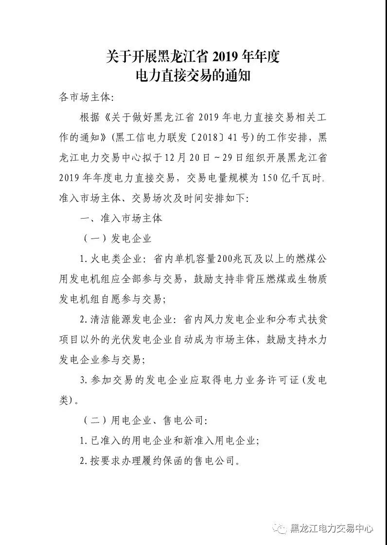 關(guān)于開展黑龍江省2019年年度電力直接交易的通知