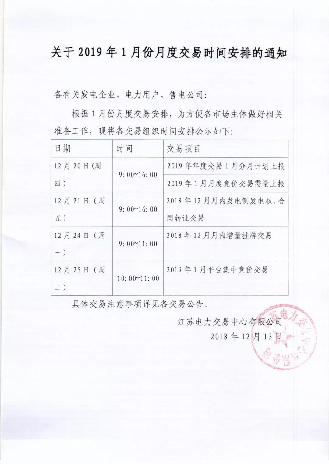 江蘇電力交易中心關(guān)于2019年1月份月度交易時間安排的通知