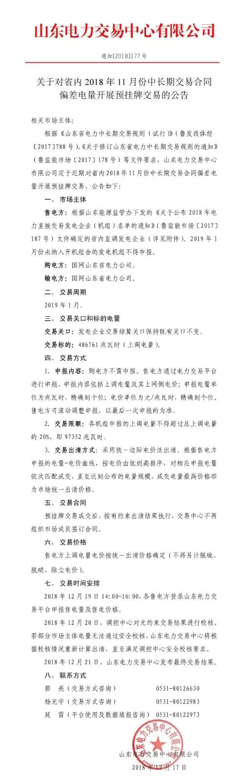 2018年12月21日,山東電力交易中心發(fā)布最終交易結(jié)果。