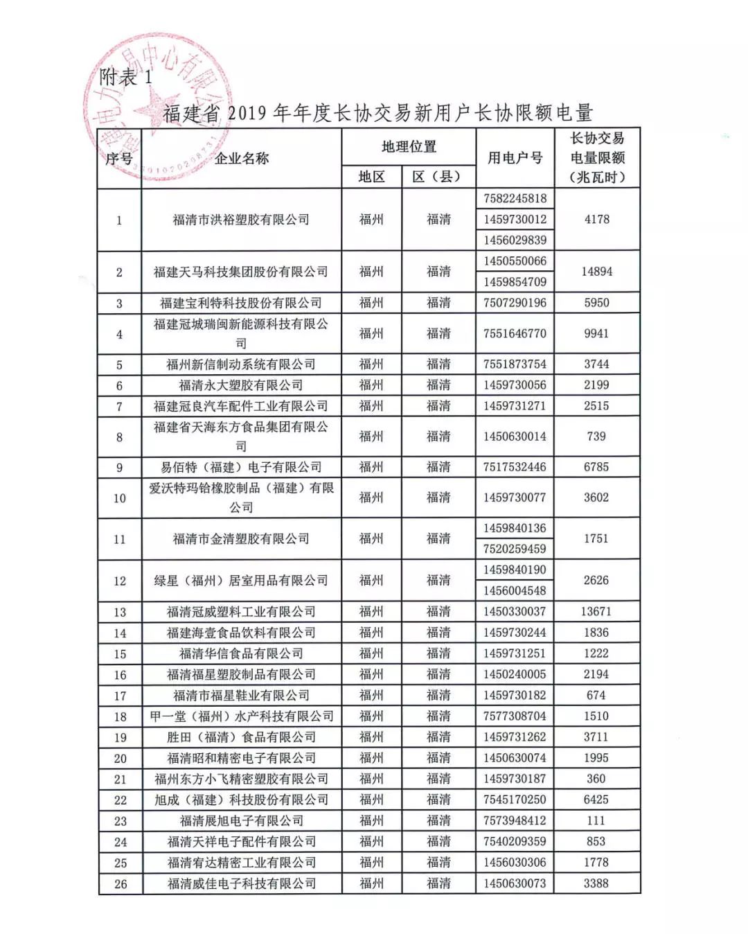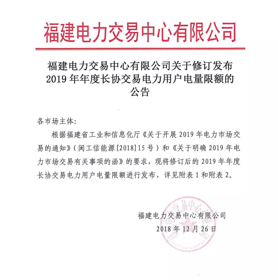 福建電力交易中心發(fā)布了《關(guān)于修訂發(fā)布2019年年度長(zhǎng)協(xié)交易電力用戶電量限額的公告》