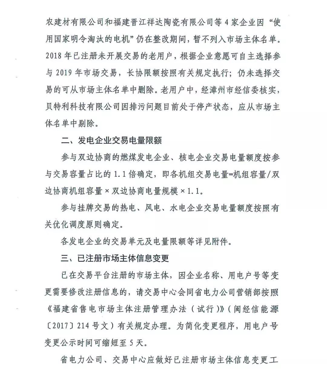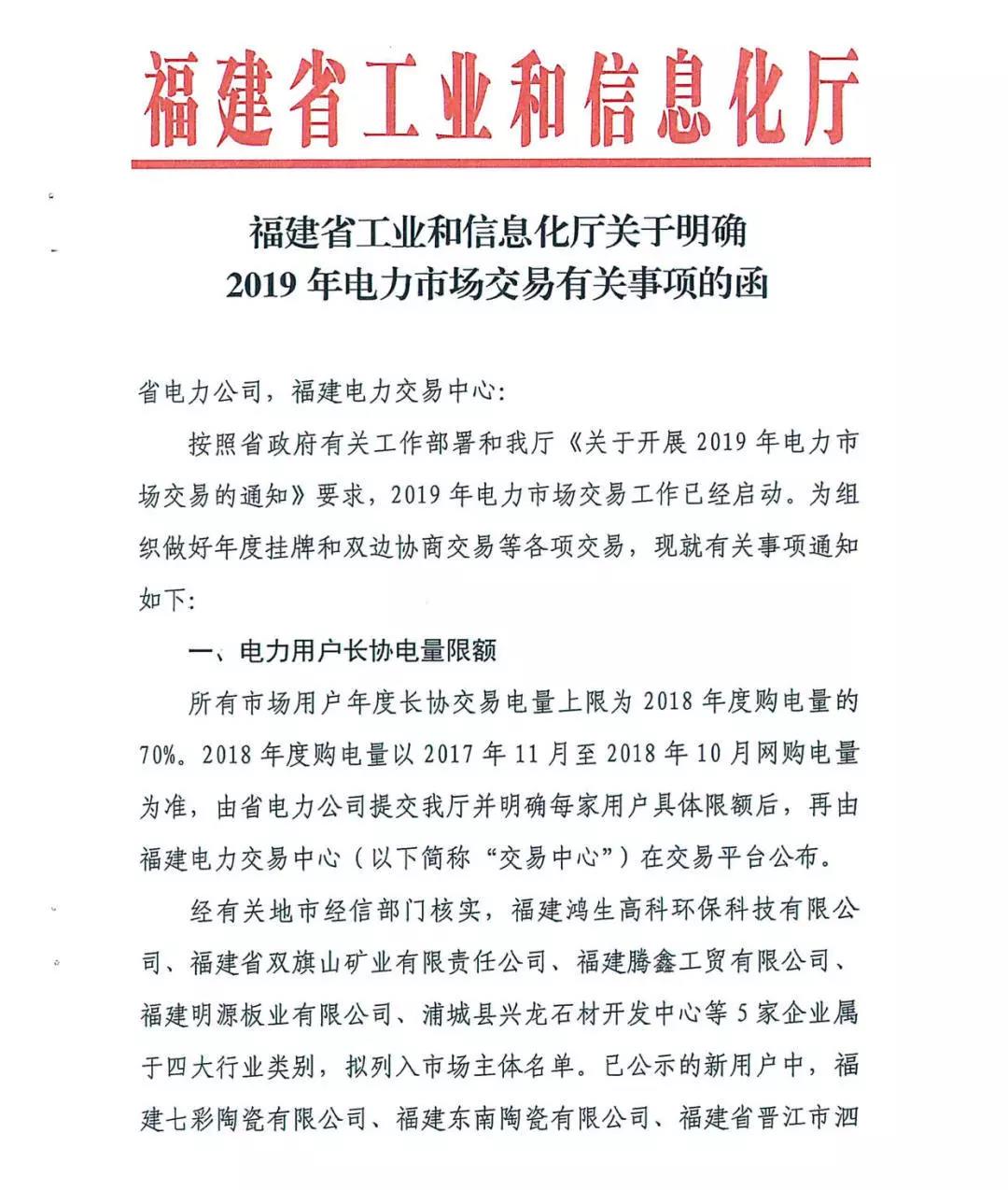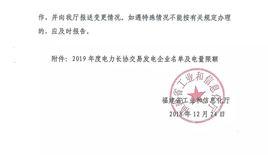 福建省工業(yè)和信息化廳關(guān)于明確2019年電力市場交易有關(guān)事項(xiàng)的函