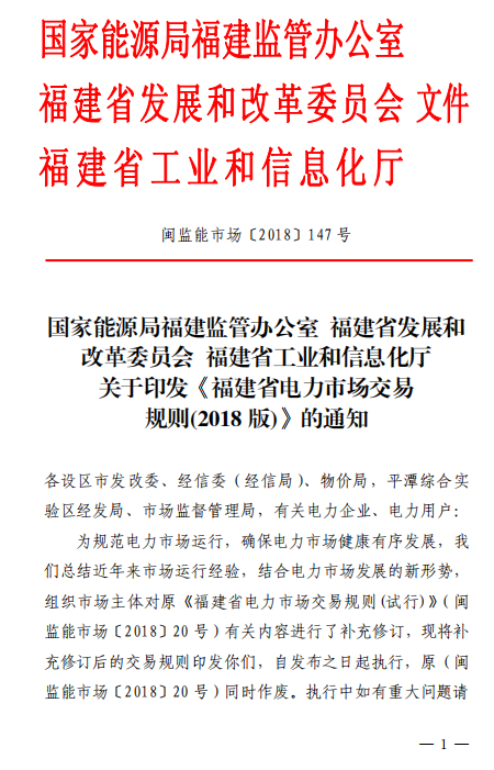 福建能監(jiān)辦發(fā)布了關(guān)于印發(fā)《福建省電力市場交易規(guī)則(2018 版)》