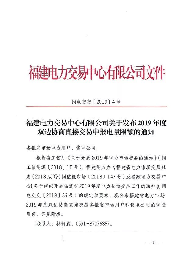 福建電力交易中心日前發(fā)布了《關(guān)于發(fā)布2019年度雙邊協(xié)商直接交易申報(bào)電量限額的通知》