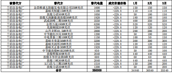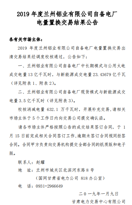 甘肅電力交易中心發(fā)布了《2019年度蘭州鋁業(yè)有限公司自備電廠電量置換交易結(jié)果公告》