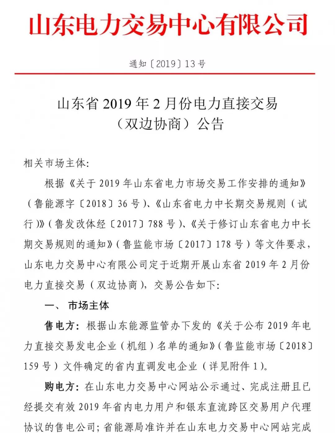 山東省2019年2月份電力直接交易(雙邊協(xié)商)公告