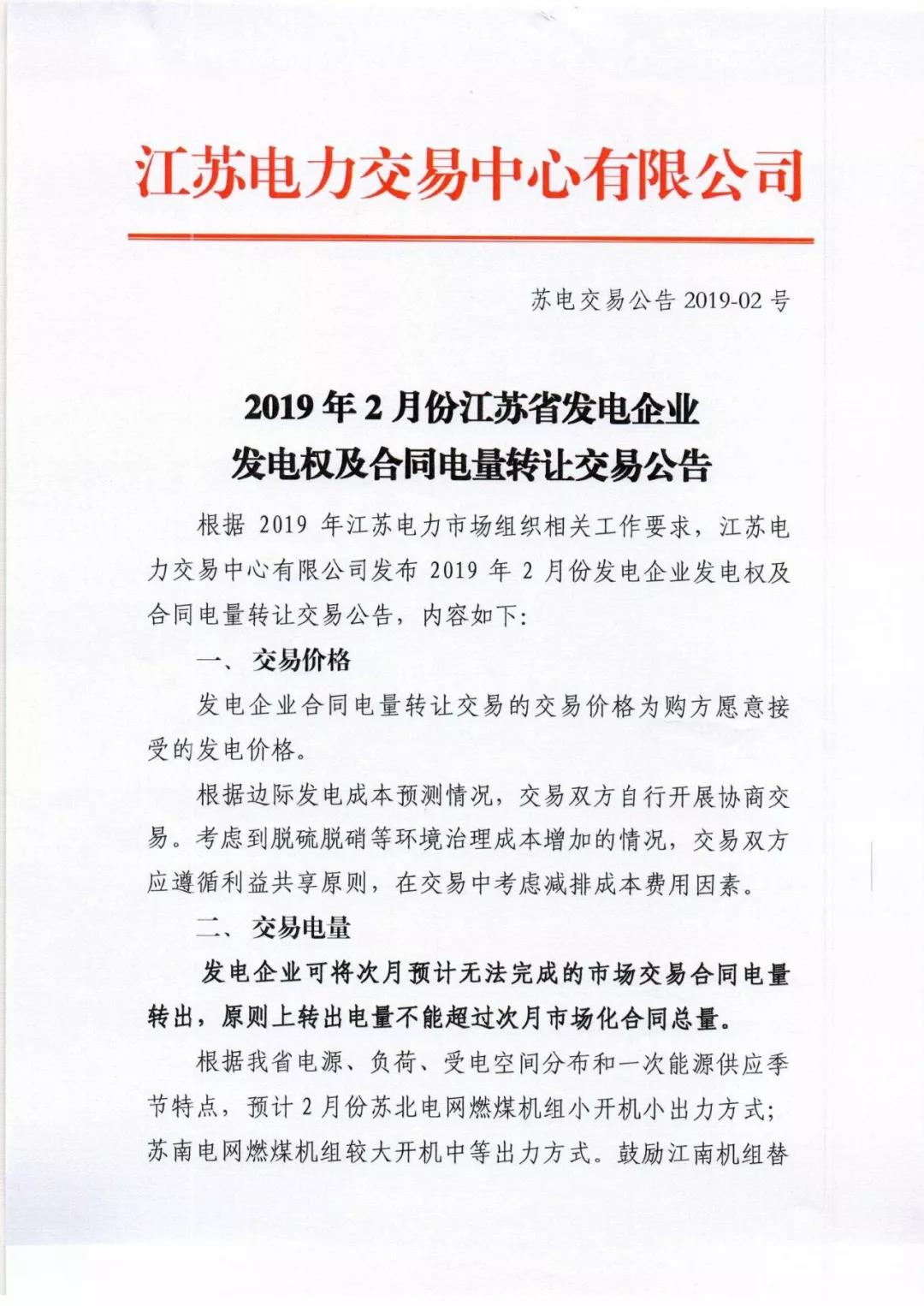 2019年2月份江蘇省發(fā)電企業(yè)發(fā)電權(quán)及合同電量轉(zhuǎn)讓交易公告