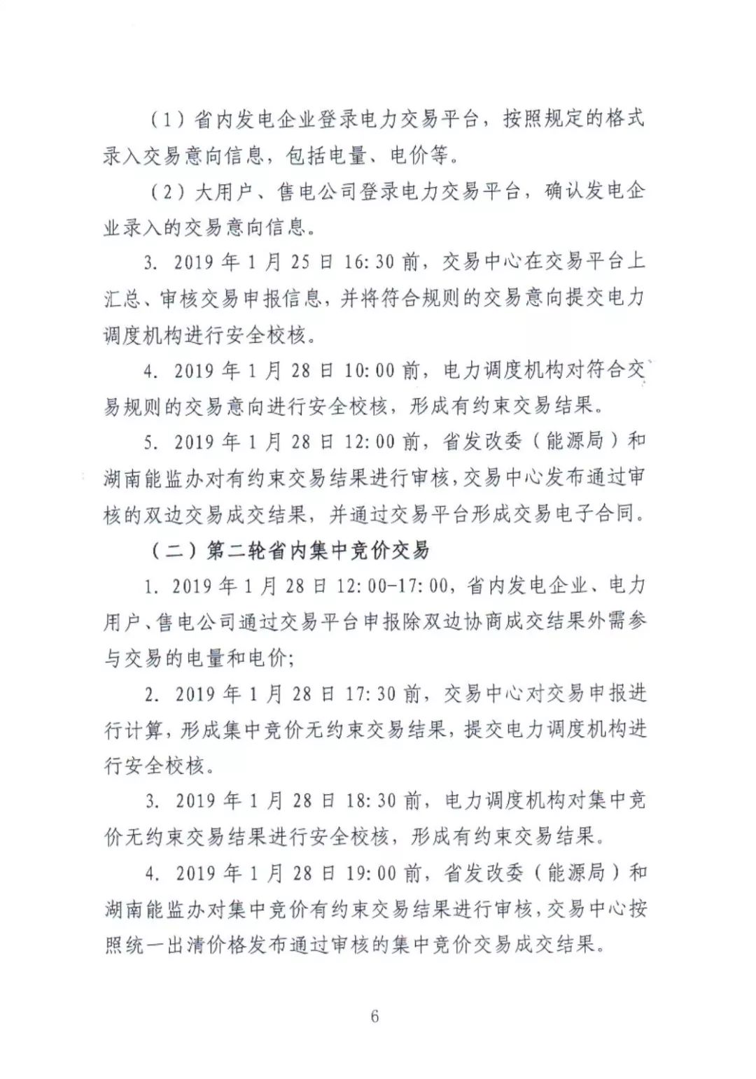 第一輪省內(nèi)雙邊協(xié)商交易2019年1月25日16:00前,交易各方通過交易平臺(tái)申報(bào)交易意向;第二輪省內(nèi)集中競(jìng)價(jià)交易2019年1月28日12:00至17:00,省內(nèi)發(fā)電企業(yè)、電力用戶、售電公司通過交易平臺(tái)申報(bào)除雙邊協(xié)商成交結(jié)果外需參與交易的電量和電價(jià)。