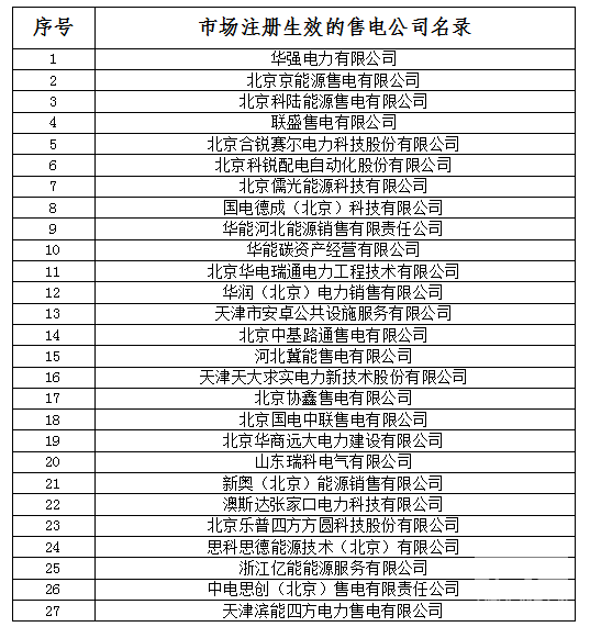 公示期間,市場有關方面未對35家售電公司提出異議。按照國家發(fā)改委、國家能源局《售電公司準入與退出管理辦法》和河北省發(fā)改委《河北省售電公司準入與退出管理細則》有關規(guī)定,35家售電公司在冀北電力交易中心的注冊手續(xù)自動生效。