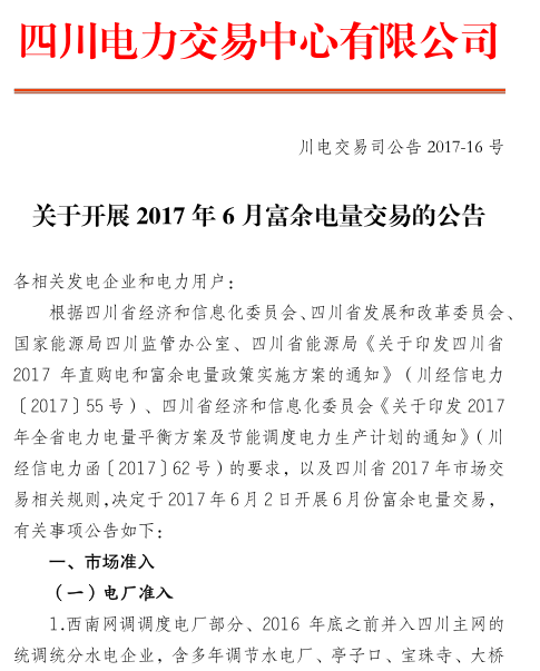 近日,四川電力交易中心發(fā)布了《關(guān)于開展2017年6月富余電量交易的公告》,將于今日(6月2日)開展6月份富余電量交易。