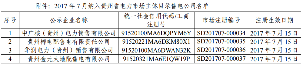 關(guān)于公布2017年7月納入貴州省電力市場(chǎng)主體目錄售電公司名單的通知