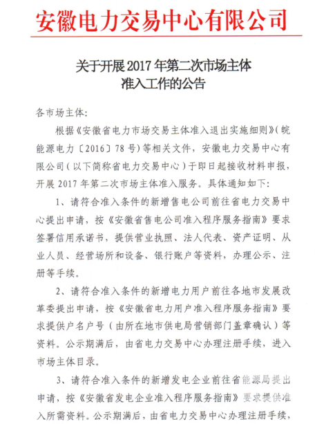 安徽電力交易中心日前發(fā)布了《關(guān)于開(kāi)展2017年第二次市場(chǎng)主體準(zhǔn)入工作的公告》,符合準(zhǔn)入條件的售電公司、新增電力用戶、新增發(fā)電企業(yè)可以向省電力交易中心、各地市發(fā)改委、省能源局提出申請(qǐng)。詳情如下: