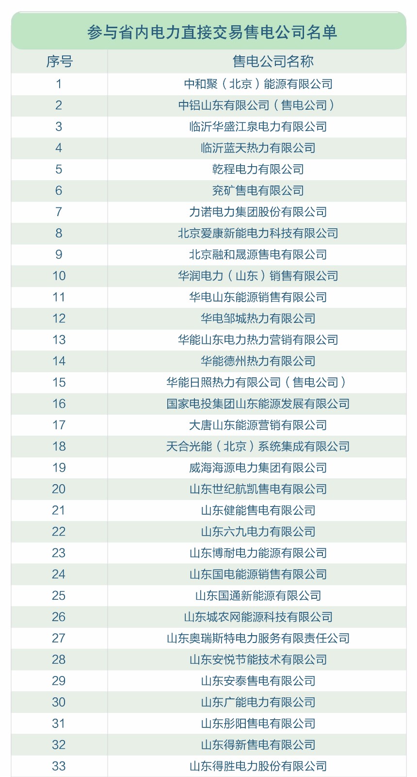 購電方:在山東電力交易中心網(wǎng)站公示通過、完成注冊且已提交有效2018年省內(nèi)電力用戶代理協(xié)議的售電公司;省經(jīng)信委準(zhǔn)許并在山東電力交易中心網(wǎng)站完成注冊、可自主參與2018年省內(nèi)電力直接交易的電力用戶(詳見下表)。