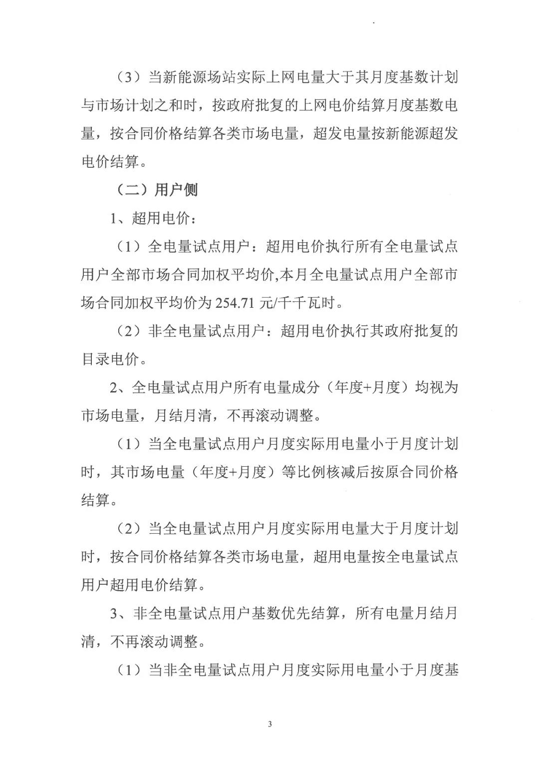 全電量試點用戶:超用電價執(zhí)行所有全電量試點用戶全部市場合同加權平均價,本月全電量試點用戶全部市場合同加權平均價為254.71元/千千瓦時。