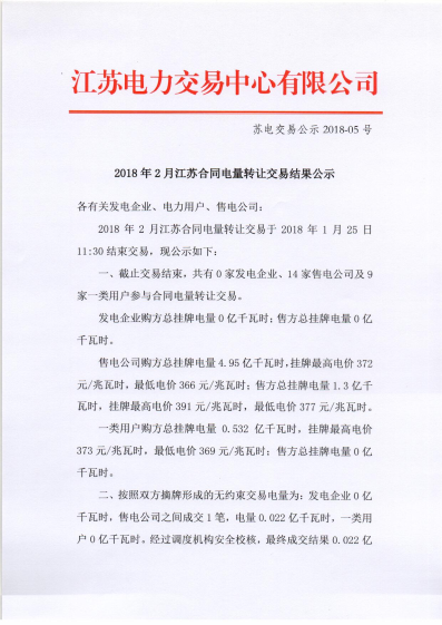 江蘇電力交易中心日前發(fā)布《2018年2月江蘇合同電量轉(zhuǎn)讓交易結(jié)果公示》如下: