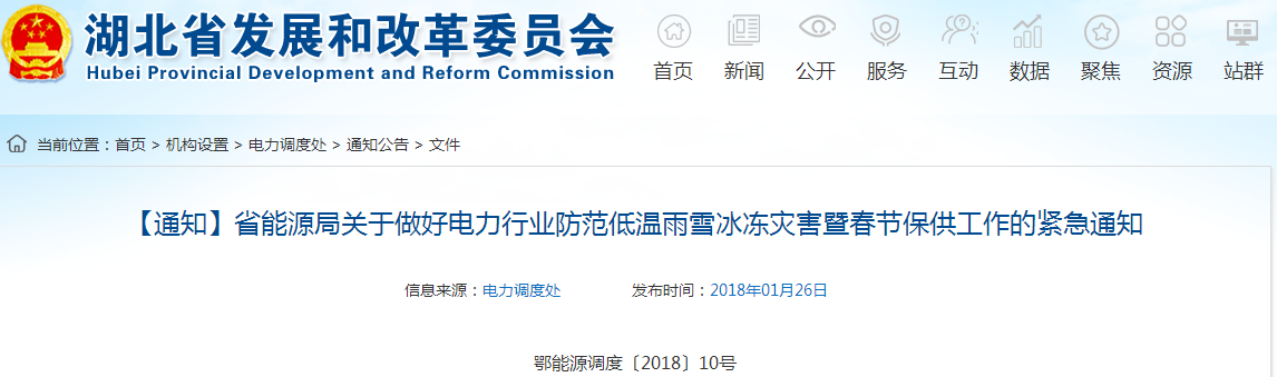 今日,湖北省發(fā)展和改革委員會(huì)公布關(guān)于做好電力行業(yè)防范低溫雨雪冰凍災(zāi)害暨春節(jié)保供工作的緊急通知,具體情況如下: