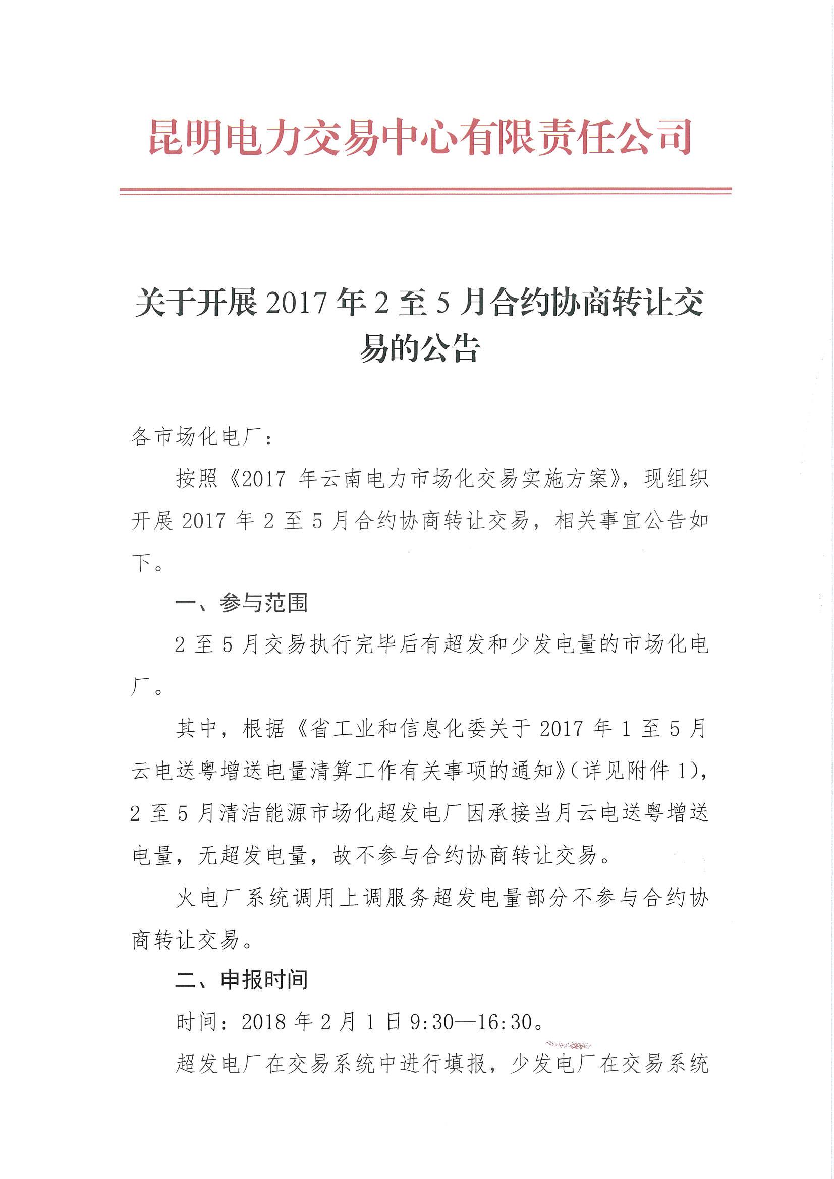 云南開展2017年2至5月合約協(xié)商轉(zhuǎn)讓交易工作