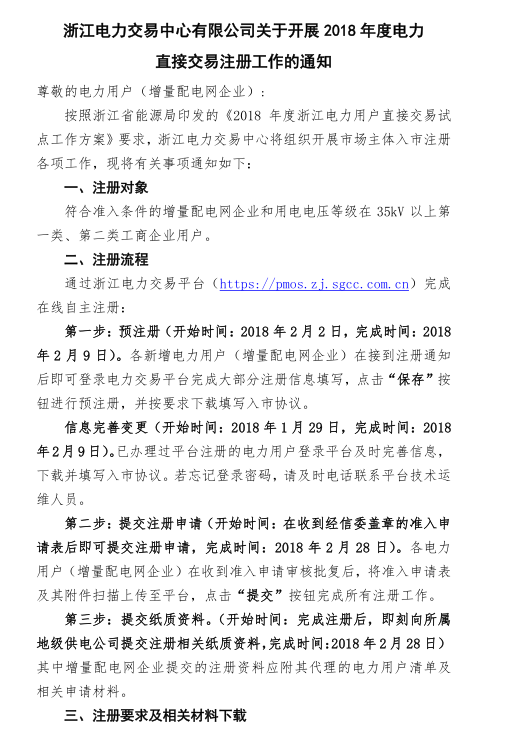 浙江電力交易中心日前發(fā)布了《關(guān)于開展2018年度電力直接交易注冊(cè)工作的通知》,通知中稱,注冊(cè)對(duì)象為符合準(zhǔn)入條件的增量配電網(wǎng)企業(yè)和用電電...